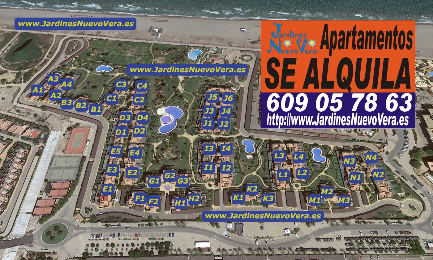 Alquiler de Apartamentos en Jardines de Nuevo Vera. La urbanización está formada por 564 apartamentos de uno, dos y tres dormitorios, en edificios de tres alturas, plantas bajas con jardín, primeras plantas con amplias terrazas y áticos con solárium. Apartamentos de 1 dormitorio y 1 baño, de aproximadamente 60 m2 construidos. Apartamentos de 2 dormitorios, con sólo 1 baño, lo más frecuente, o con 2 baños (1 baño completo y 1 aseo con ducha) de aproximadamente 80 m2 construidos. Apartamentos de 3 dormitorios con 2 baños (1 baño completo y 1 aseo con ducha) de aproximadamente 110 m2 construidos.